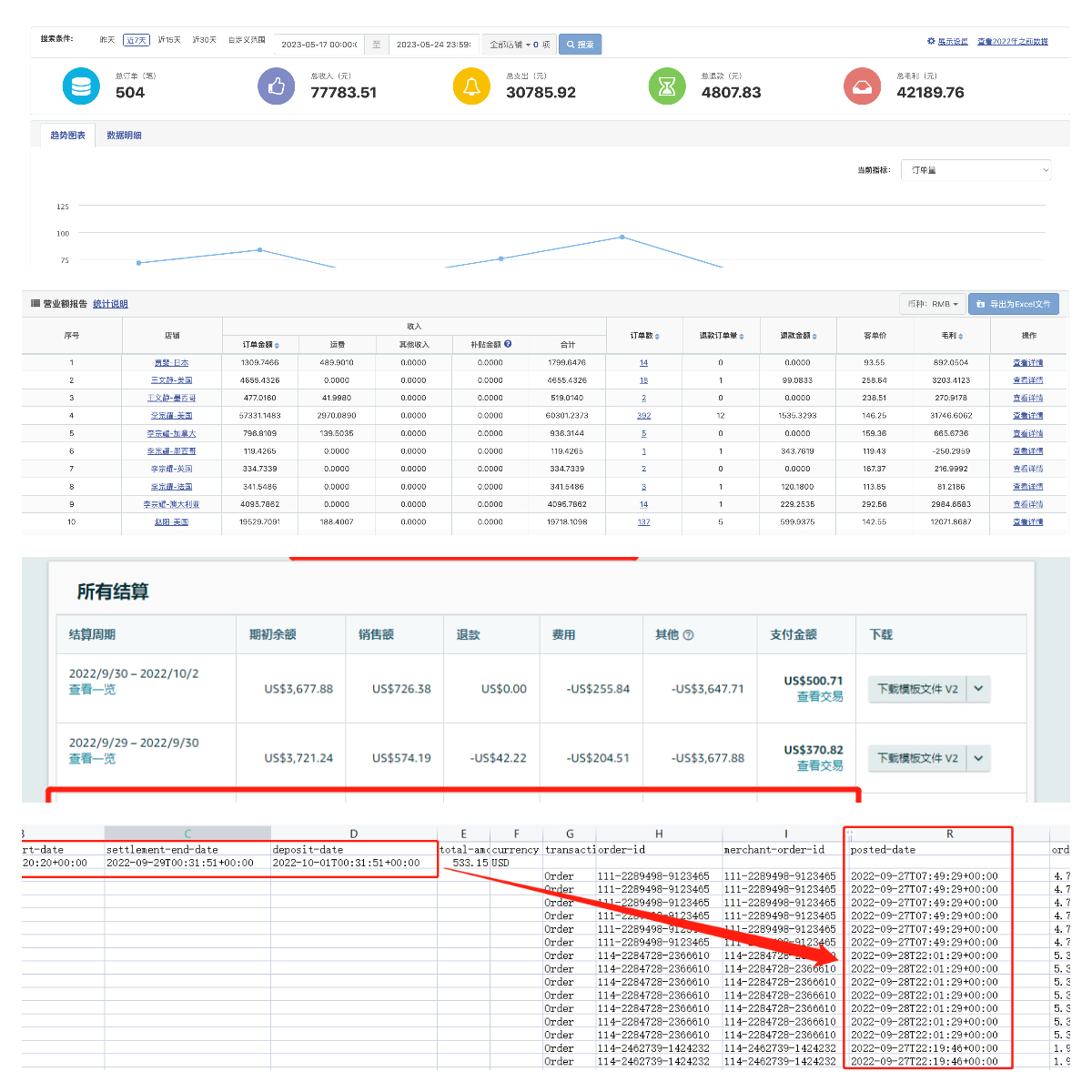 每天同步多个店铺的亚马逊后台-付款报告数据,形成财务的销售回款分析面板,通过面板可以查看所有店铺未结算和已结算的预留账户金额、回款明细和汇总金额数据。
